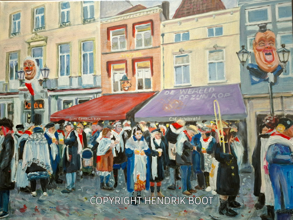 Schilderijen en aquarellen van Hendrik Boot van het carnaval in Bergen op Zoom, Vastenavend in Krabbegat. Jaarlijks gaat hij op “studiereis” langs de locaties van de leut en probeert die later in verf te vangen. Heeft u belangstelling? Kom kijken, stuur een mailtje of bel even.